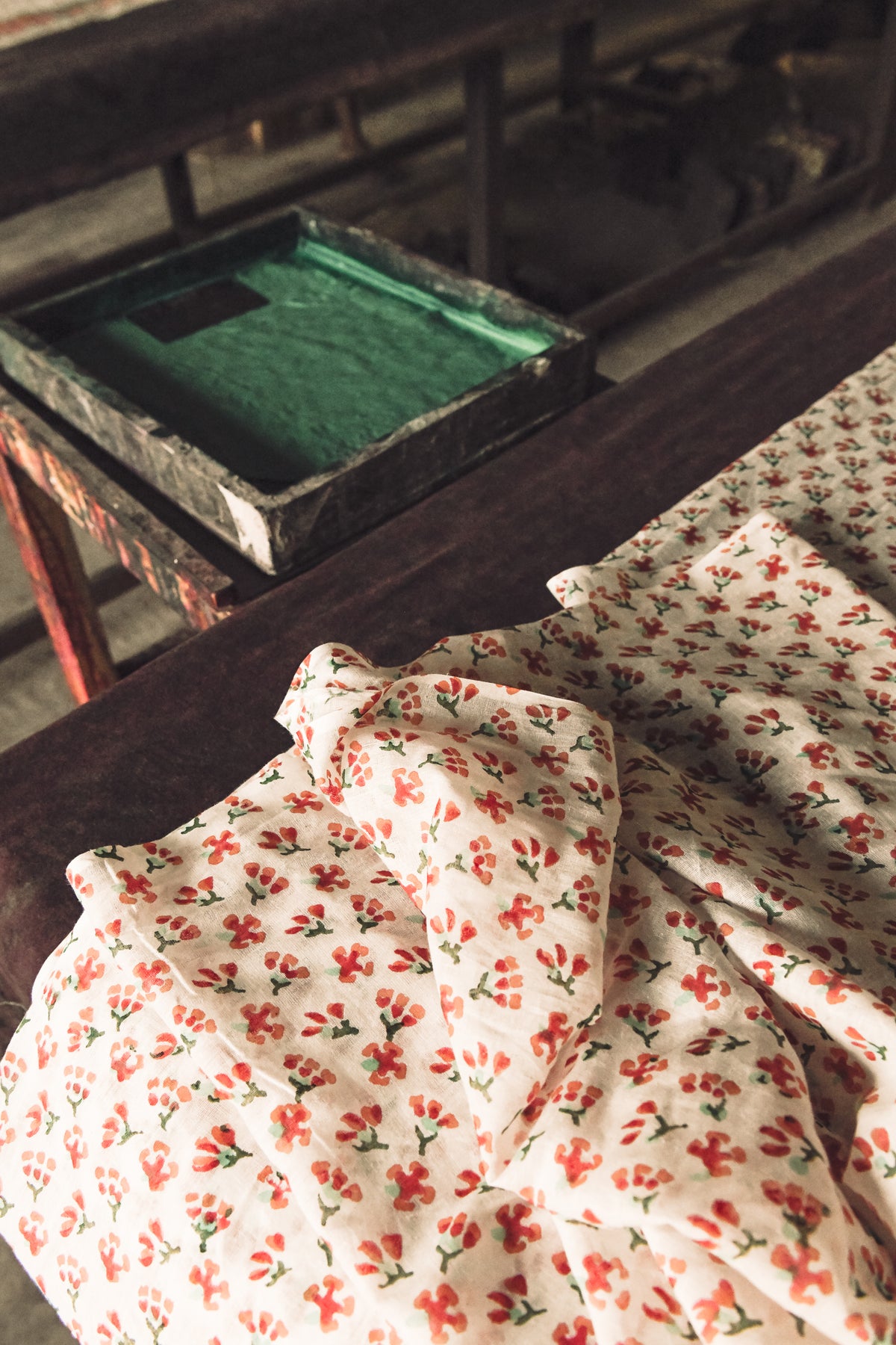 Our signature Kyra Dress in a maxi length, delicately adorned with traditional hand-block printed blooms in peach hues, each petal and pattern tell a story of elegance.