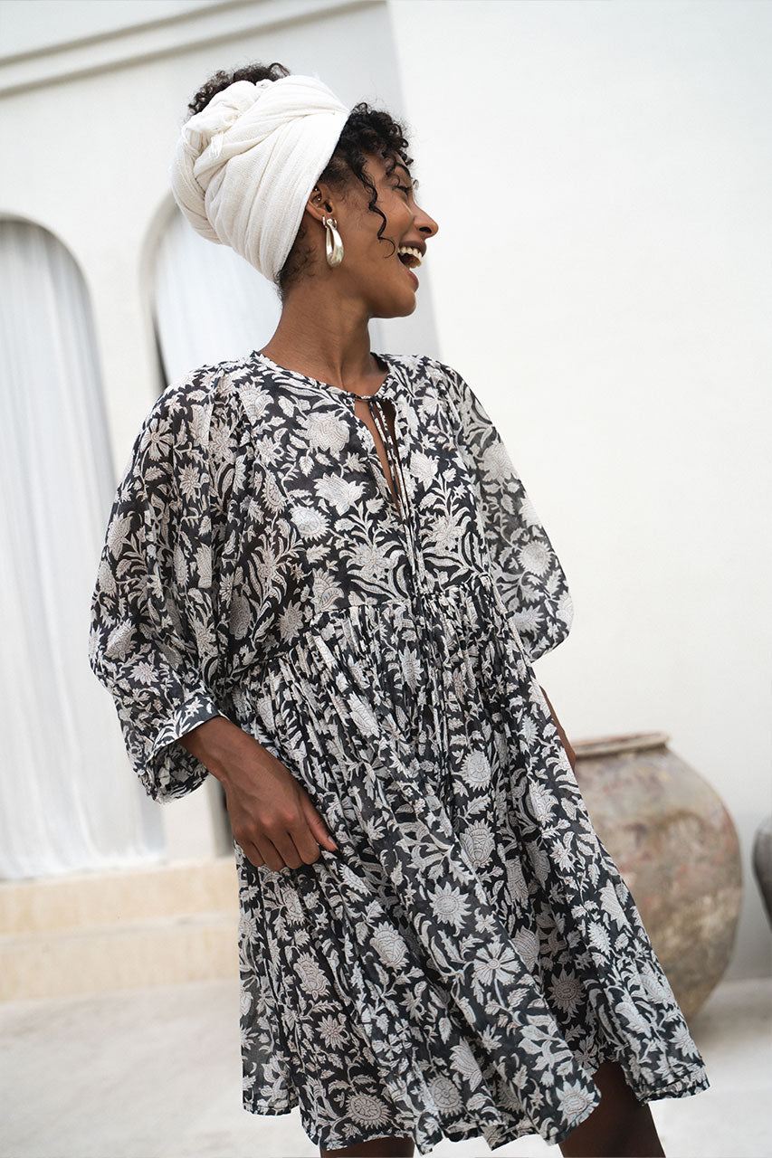 The beauty of block print is stunning on this everyday mini dress. A flattering feminine design featuring optional tie detailing on the neckline, romantic billowing sleeves and a full bodied skirt free of underlining, making it the most comfortable style due to the heavenly soft lightness of the material.