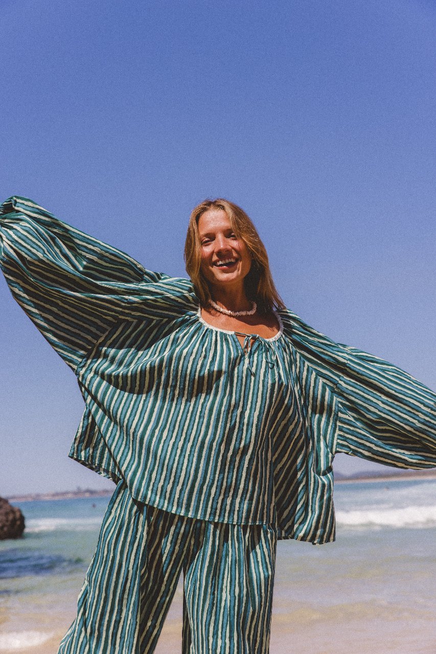 The Ria Blouse has been ethically handcrafted with 100% cotton into the most comfortably soft, billowing blouse. Featuring an adjustable gathering at the neckline with a tie, and cuffs to finish the delightfully large sleeves. Our very first screen printed style, the making of this garment serves to support the preservation of hand craftsmanship and women empowerment in India.