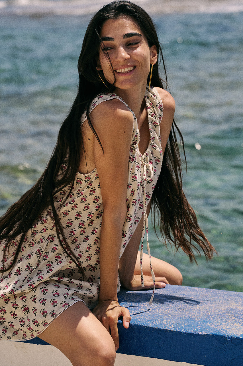 The Sundress Mini features a sleeveless silhouette with an adjustable tie gathering at the neckline and convenient pockets. Perfect for warm summer days or layered during the cooler months. Now available in one of our most popular prints, Peony.